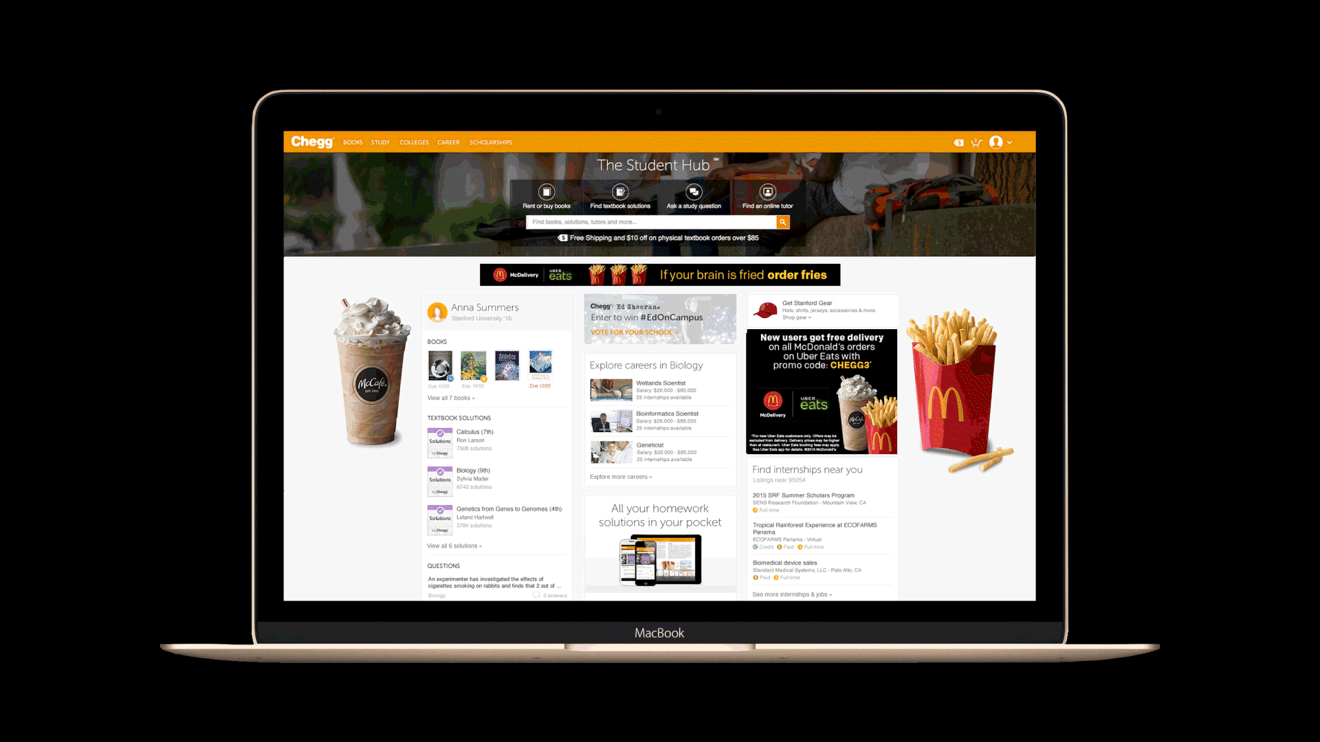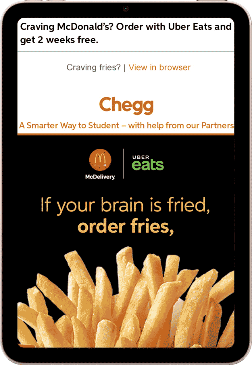 UberEats and McDonalds partnered up to offer discounted food delivery to students. I developed a pitch for McDonald’s & UberEats to partner with Chegg and they loved it. Check out the campaign below.